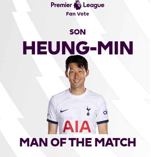 손흥민은 11일(한국시간) 영국 런던의 토트넘 홋스퍼 스타디움에서 열린 뉴캐슬과의 2023-2024 EPL 16라운드 홈 경기를 4-1 대승으로 이끌고 리그 공식 홈페이지의 '맨 오브 더 매치(MOM·최우수선수)'로 선정됐다.